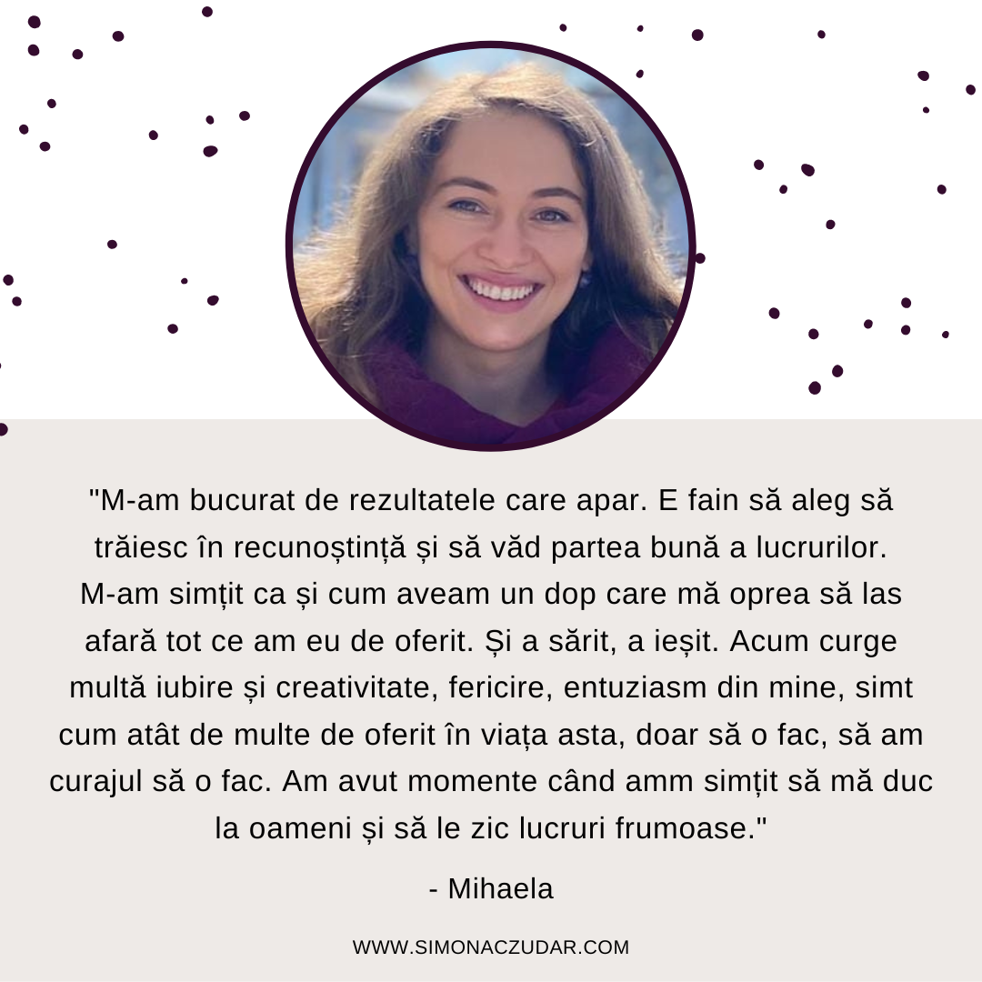 „În urmă cu o lună, mă simțeam pierdută. Acum, sunt pe drumul meu, trăind conștient și în armonie cu ceea ce sunt cu adevărat. Mulțumesc, Simona, pentru această călătorie!”