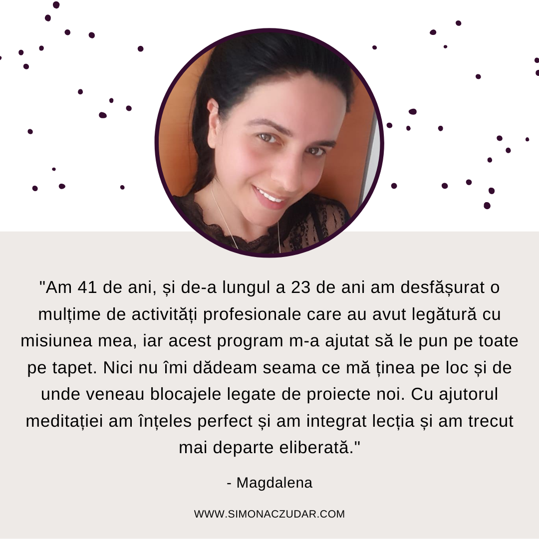„Am simțit o schimbare profundă. Programul m-a ajutat să mă reconectez cu mine însămi și să îmi clarific adevărata misiune. Fiecare exercițiu m-a ghidat spre o mai mare înțelegere și o viață mai echilibrată.”